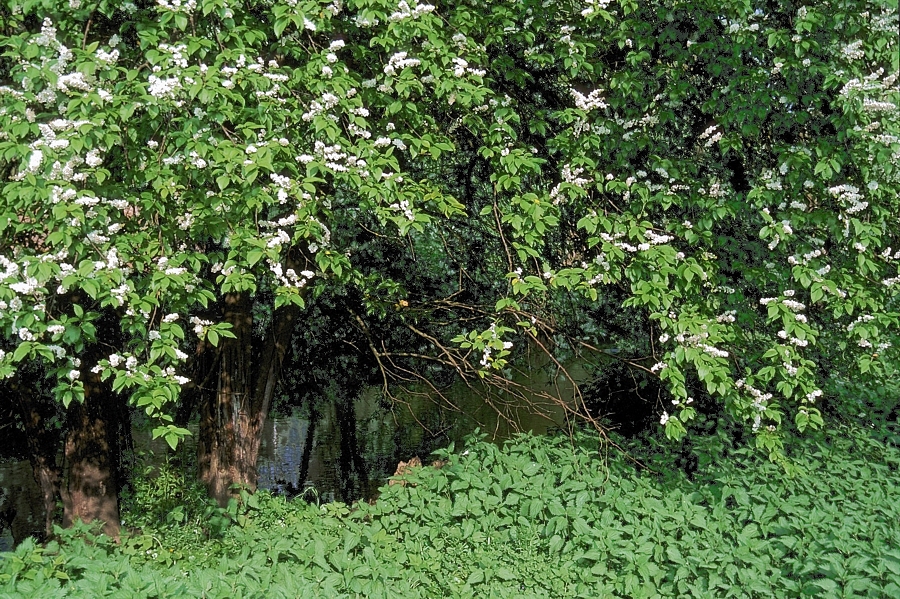 Im Mai zieren die Blüten der Traubenkirsche die Gewässerränder